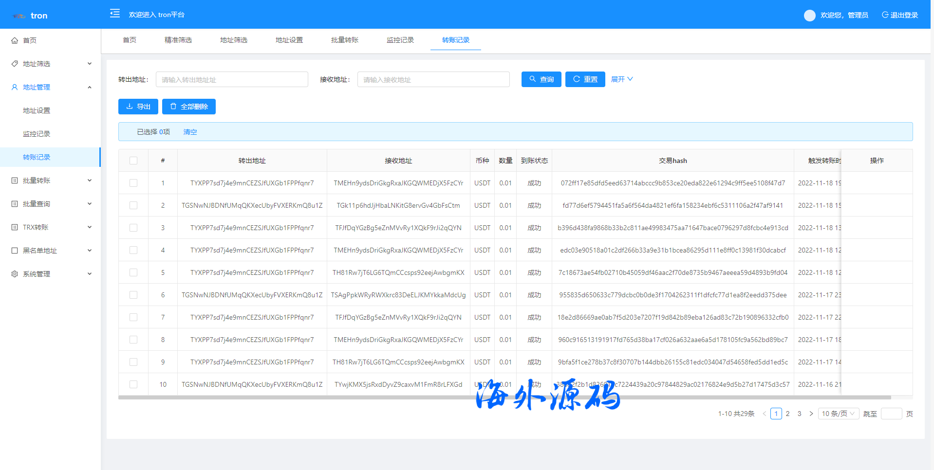 特色功能 trx地址监控 a地址监控c地址 c地址有交易 a地址会像c地址交易的地址进行返现 返现金额可设置 可监控 c地址转账记录