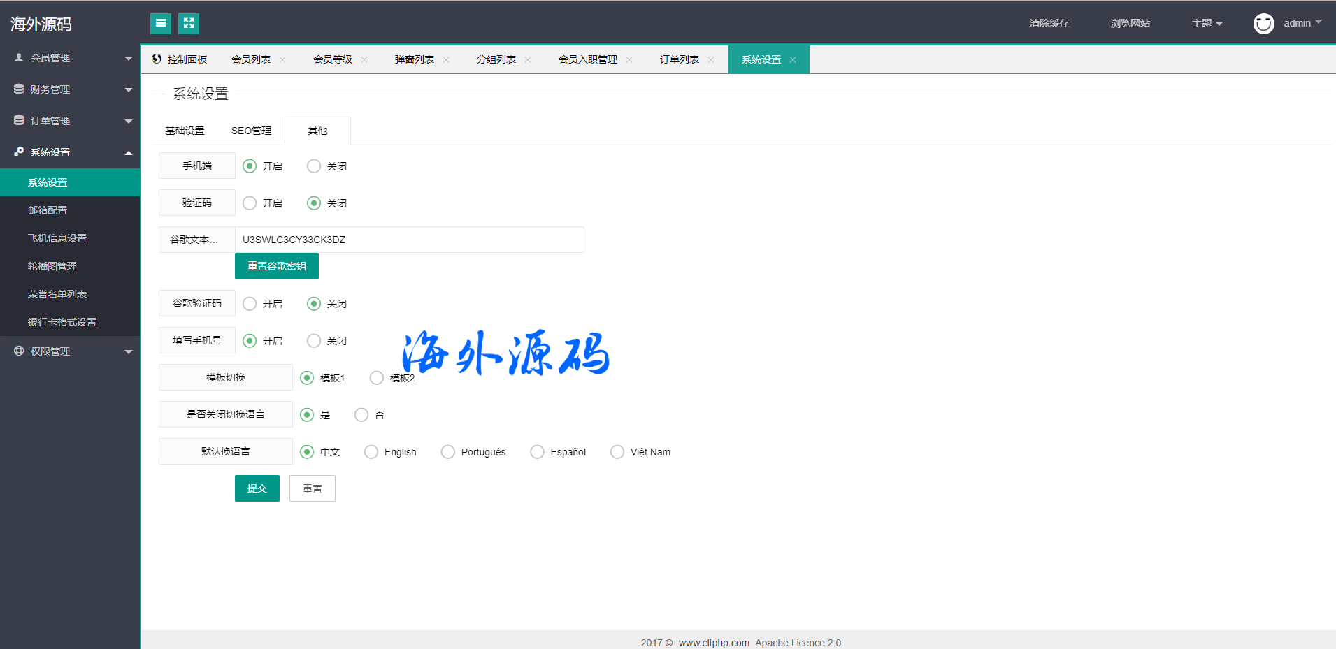 系统前端多语言自带多个语言包可以自行添加,后台支持设置默认语言和关闭前端语言选择开关