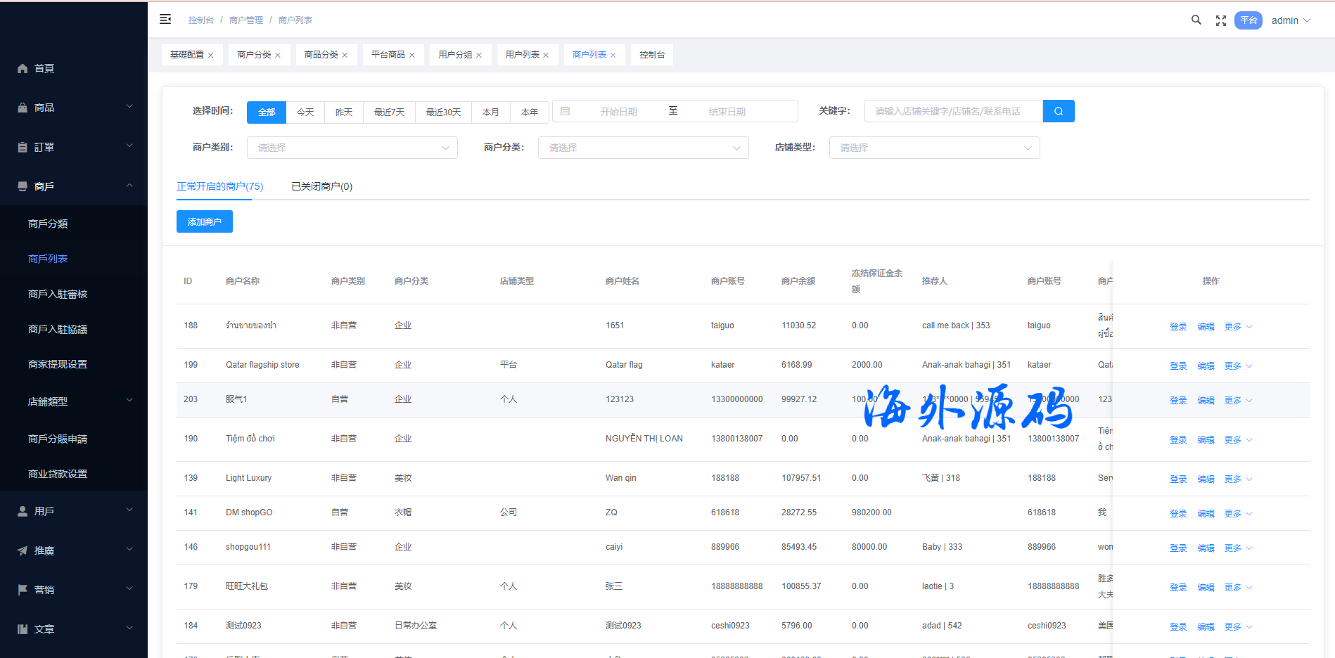 系统特点关键词:多商户入驻、商品一键铺货、进货差价、平台代发、商品采集、店铺保证金、USDT充提、店铺虚拟访客关注加购数据、一键批量注册用户、批量下单爆单、定时下单、自建物流信息等