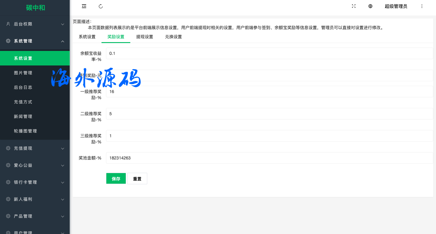 系统功能完善带代理后台,功能有签到,余额宝,爱心捐赠,邀请,转账等功能