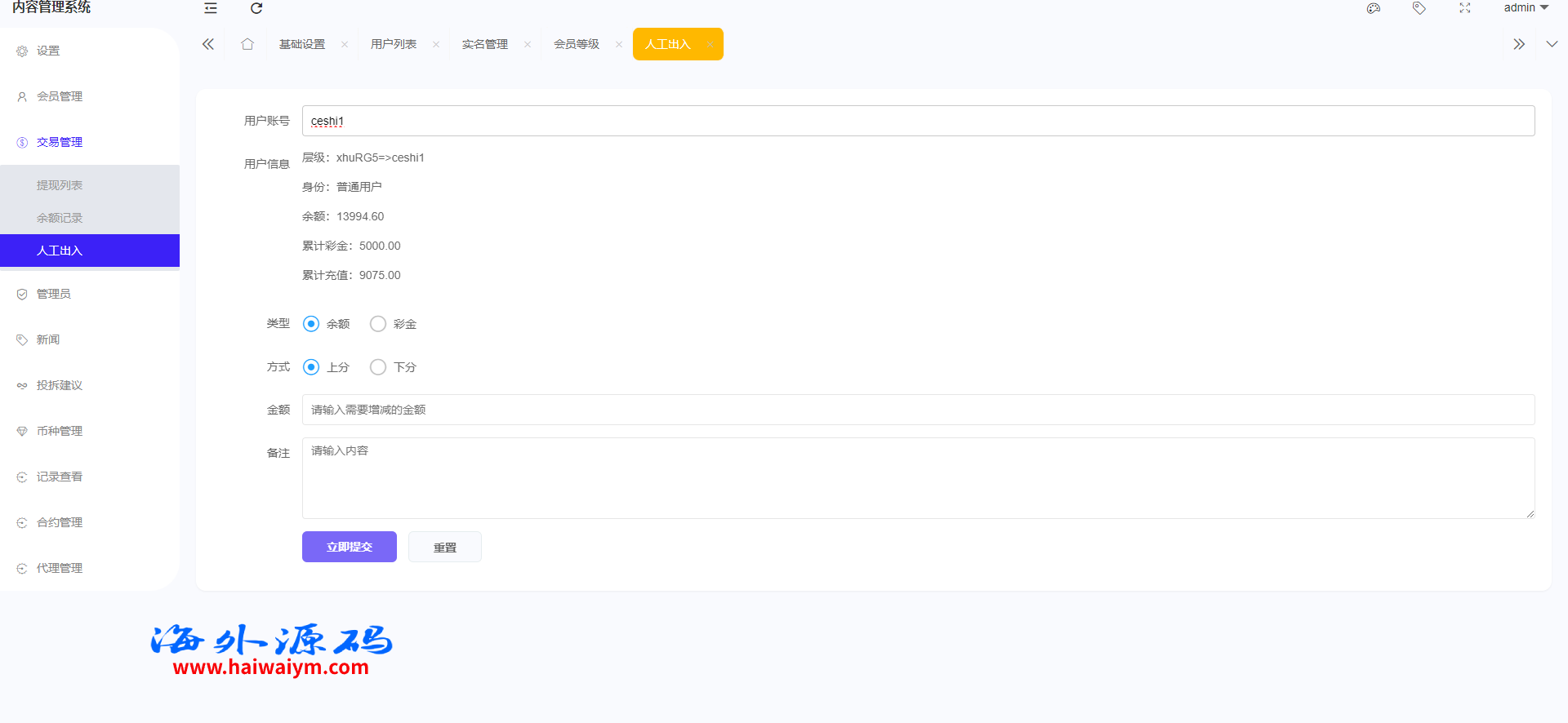 4.后台增加手动上分下分功能
