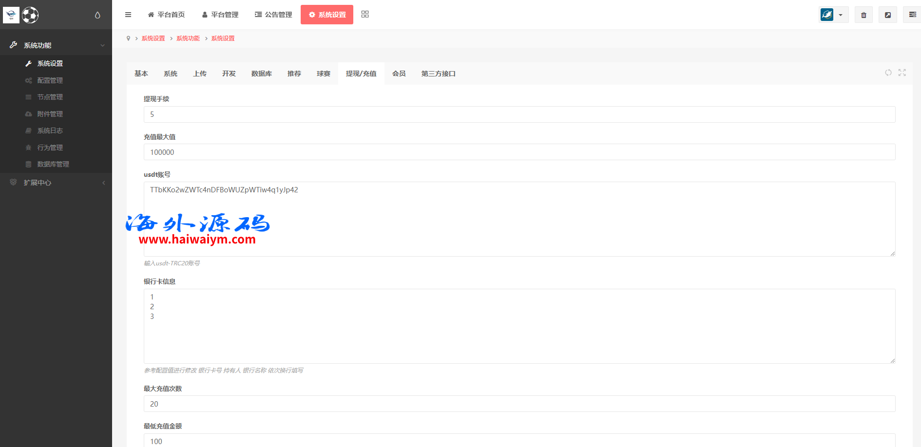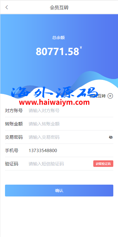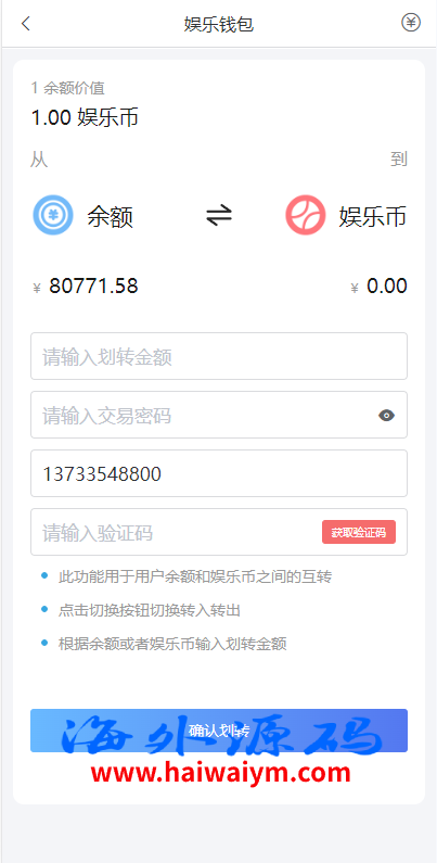 支持用户余额互转,充值方式有银行卡、usdt、口令红包、易支付,ng钱包互转余额,后台带回收功能