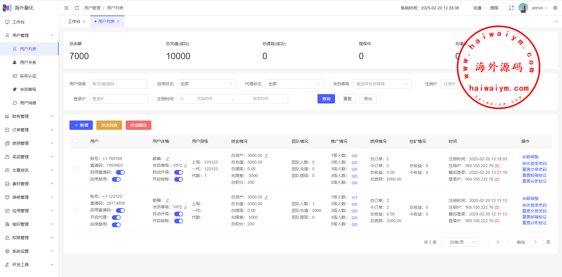 17、代理功能,后台开启用户为代理,即可登录代理端查看代理下级用户情况