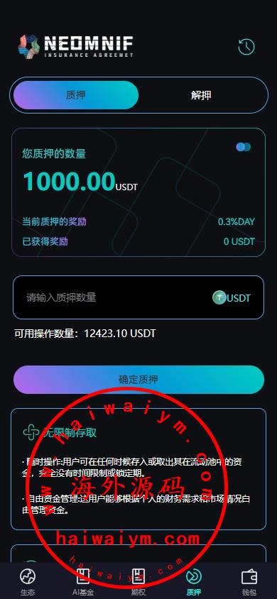 综合性数字资产管理平台,整合了质押、AI基金投资、加密货币交易、邀请奖励和社区投票等多种功能