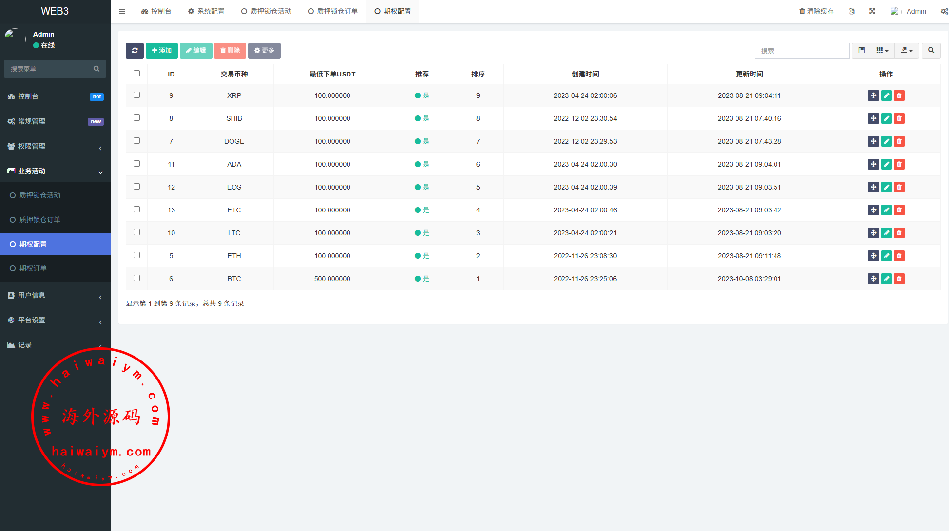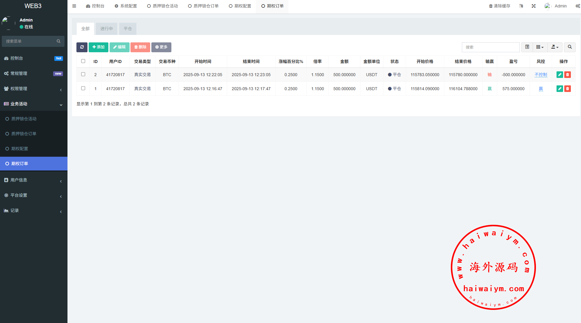 UI重新定制二开,前端VUE开发,后端php的FastAdmin框架前端多语言,支持期权交易,质押,信用分等功能系统支持E链支持授权,源码全开源带源码