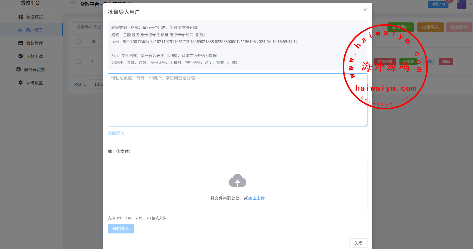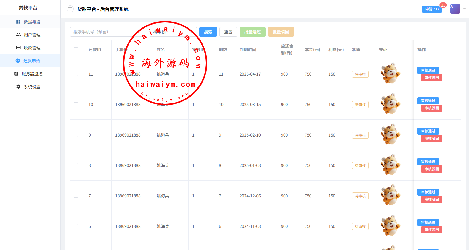 系统前端后台VUE开发,服务端JAVA开发全开源带源码后台可一键填充用户数据生成贷款逾期前端用户手机登陆,就能查看自己的欠款信息