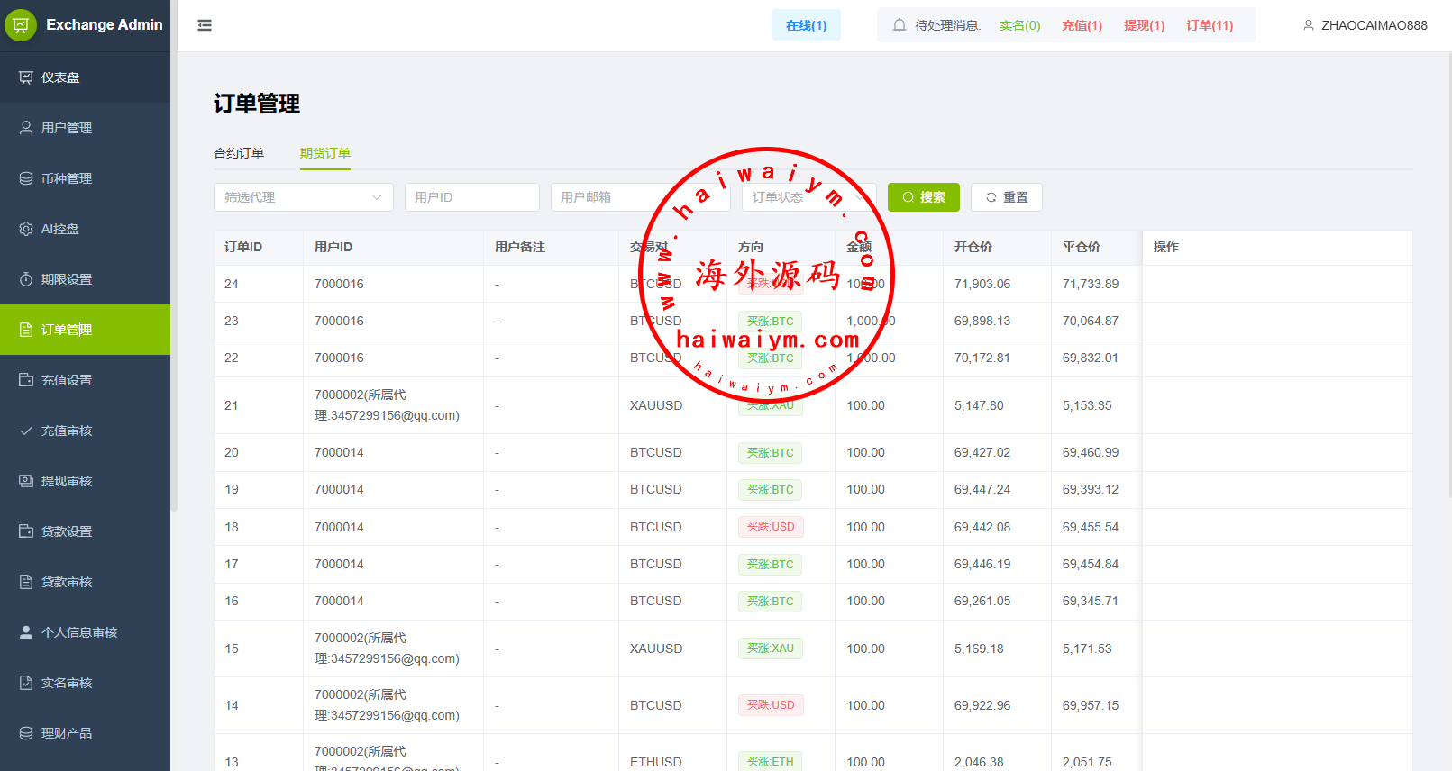 功能支持:合约,期权,贷款,理财,实名认证,权限代理,AI控盘等功能