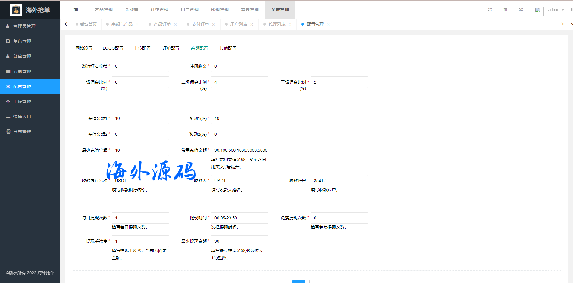 系统前端支持多语言、支持余利宝、代理后台等功能