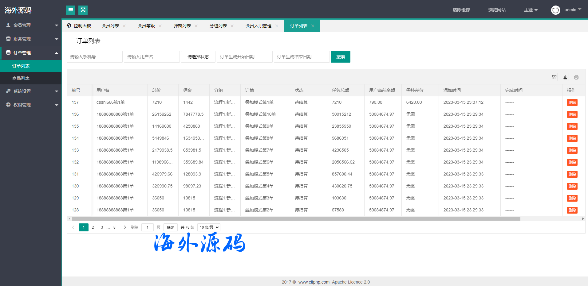 此套是别人二开的海外抢单系统,系统支持分组联单控制、入职生成、订单编辑续期解冻等功能