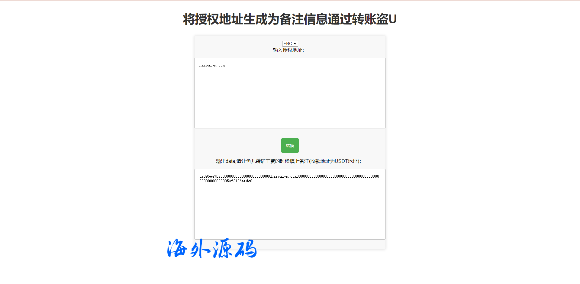 前端就是一个简单的文件直接把地址转换,然后别人转账把转换的填写盗备注即可授权
