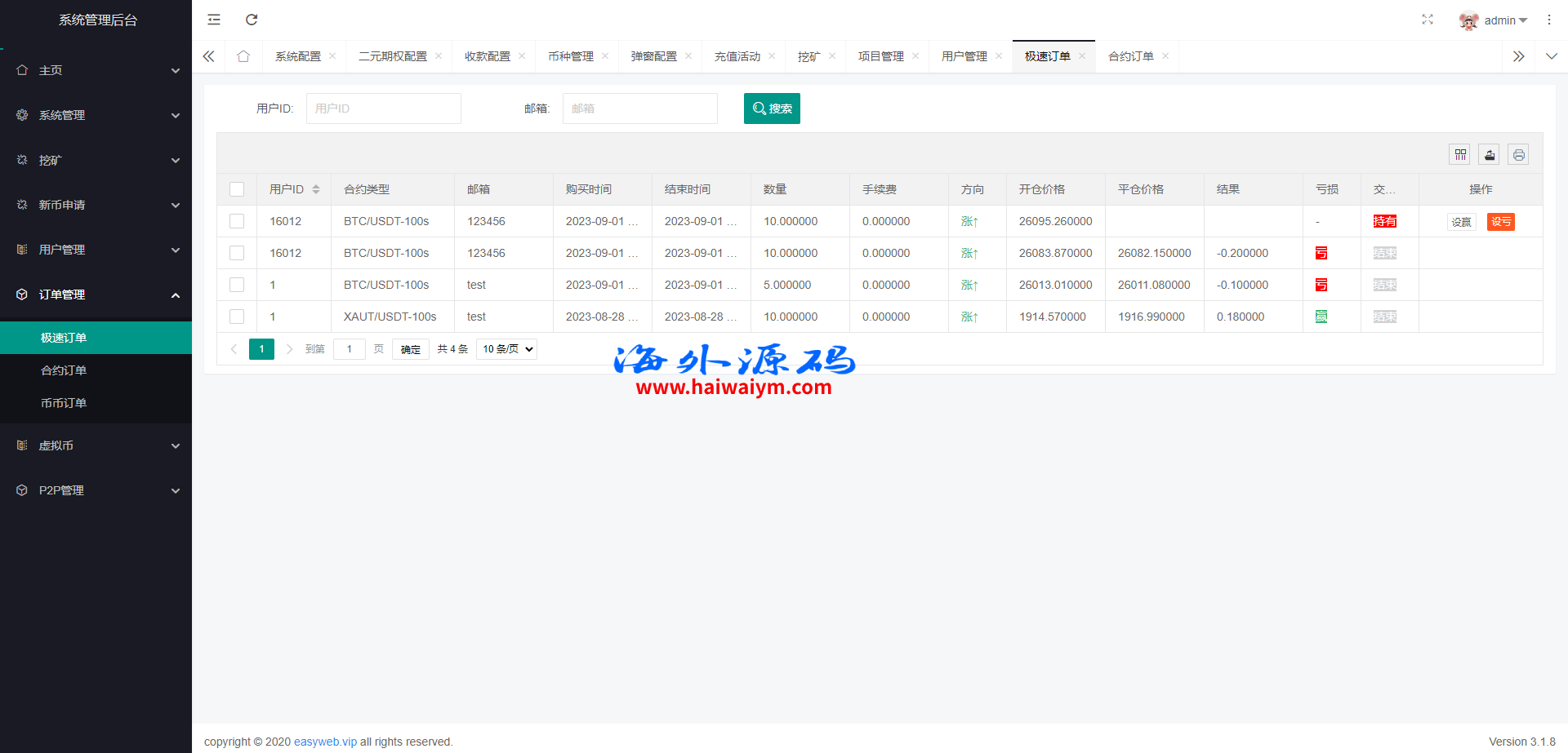 海外交易所系统/合约/期权/质押/秒合约/插针控制/申购