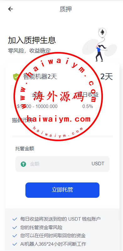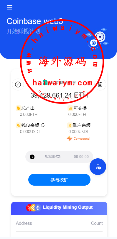 1、二开矿池的功能,用户参与挖矿,参与的用户根据1~4999 USDT, 1.00%、5000~19999 USDT, 1.30%、20000~49999 USDT, 1.60%、50000~99999 USDT, 2.00%、100000~299999 USDT, 2.50%、300000~2000000 USDT, 3.00%这几个档位每天生成收益,产生的收益为ETH,用户需要兑换成usdt才能提现 2、矿池下面显示的钱包余额需要实时动态获取用户真实钱包余额