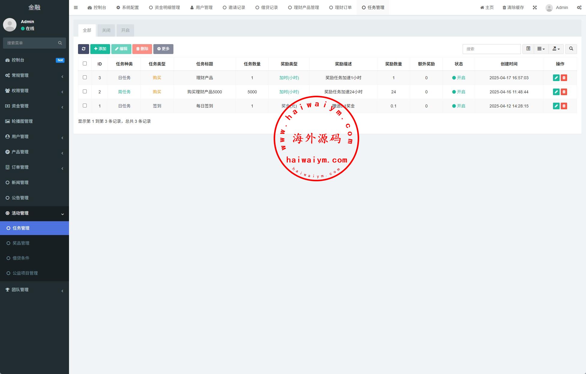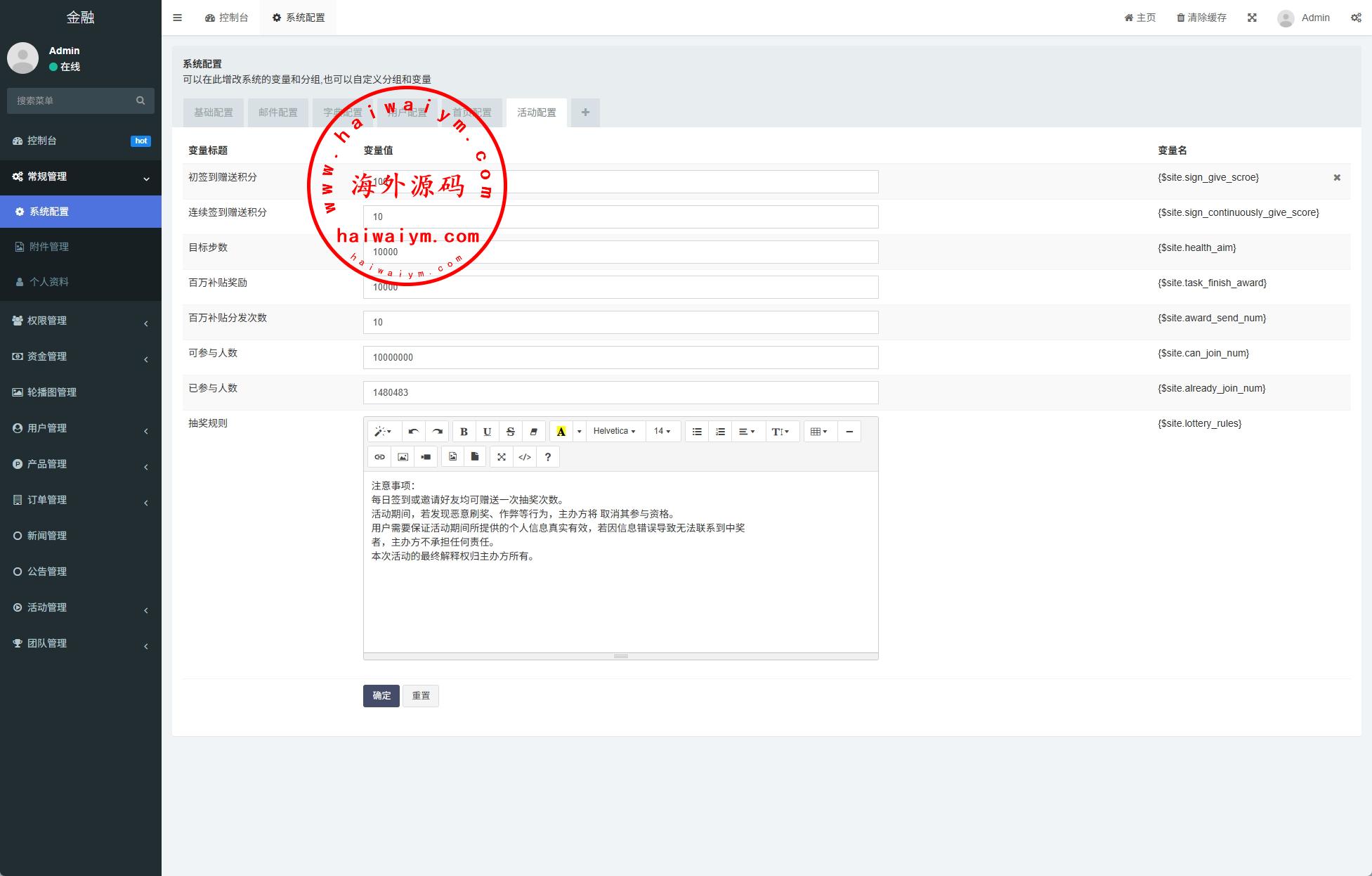 前端VUE开发,后端FastAdmin框架全开源系统功能:签到、抽奖、爱心公益、借贷、健康数据、积分商城、活动任务等功能