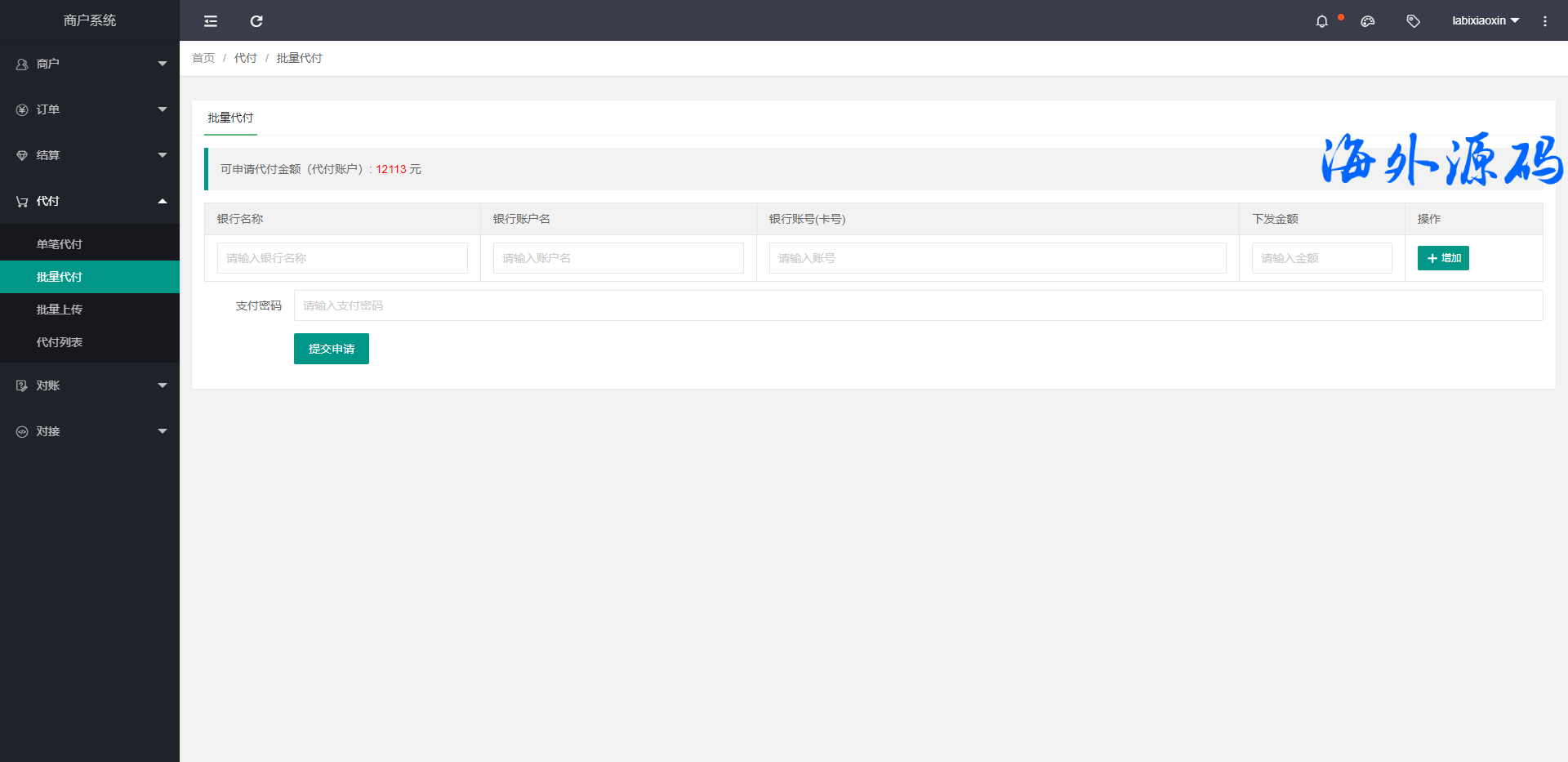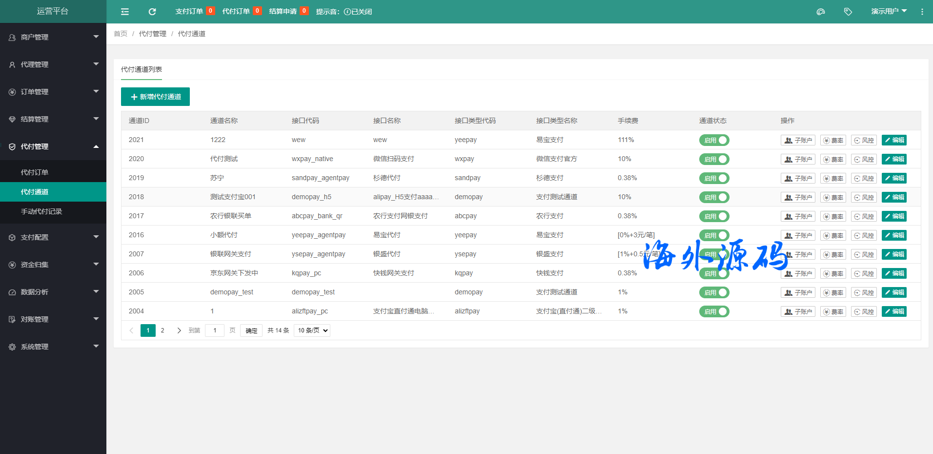 完善的支付通道,代付通道对接,实现通道、以及通道子账号的接口轮询。