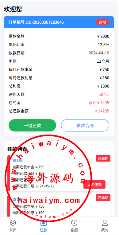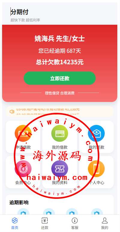系统前端后台VUE开发,服务端JAVA开发全开源带源码后台可一键填充用户数据生成贷款逾期前端用户手机登陆,就能查看自己的欠款信息