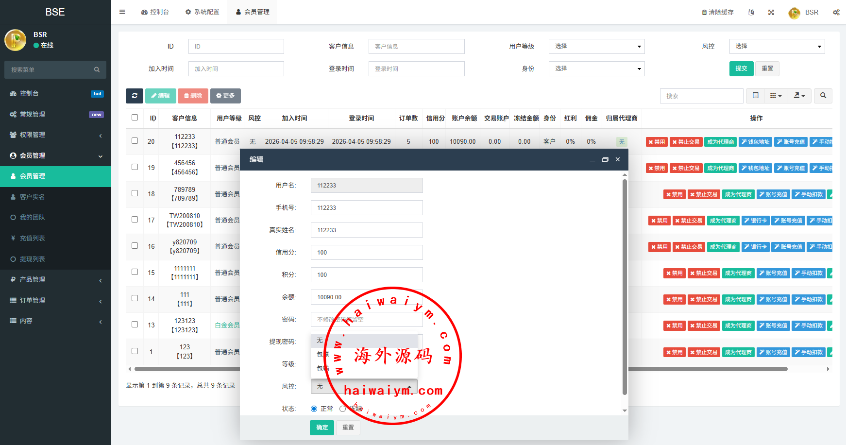 系统功能:信用分,实名认证,usdt充值提现,用户单控,订单控制等功能