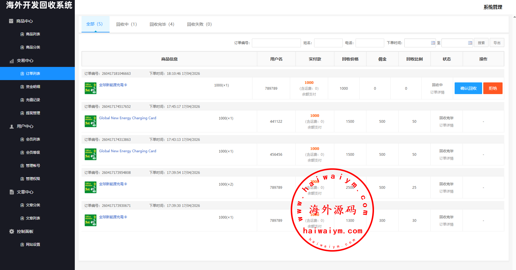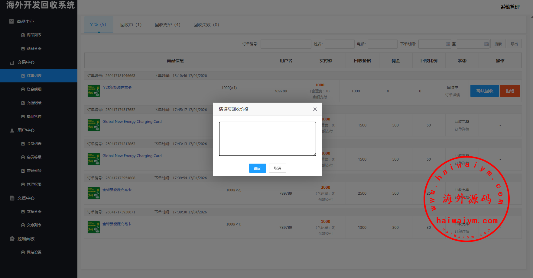新版UI新能源商品回收系统,前端多语言支持自适应,系统支持:访问邀请码,自定义回收价格,信用分,充值汇率,默认货币,权限代理等功能